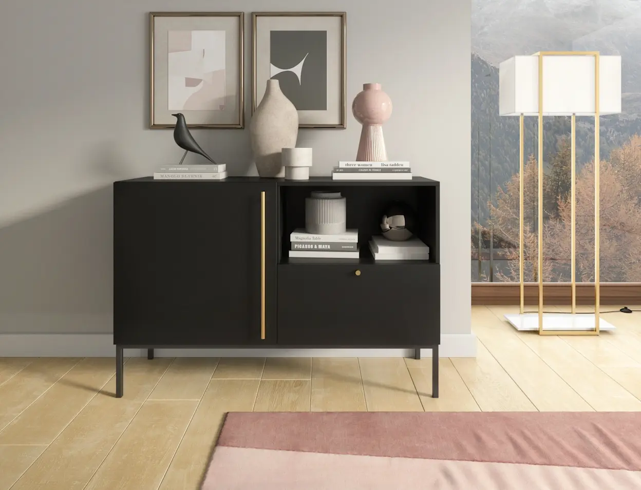 Czarne wykończenie komody Lanzzi dodaje elegancji i stanowi doskonałe uzupełnienie różnorodnych aranżacji sypialni. Dzięki licznej ilości schowków mebel zapewnia praktyczny przepis na utrzymanie porządku w pomieszczeniu, jednocześnie ładnie eksponując Twoje ulubione dekoracje.