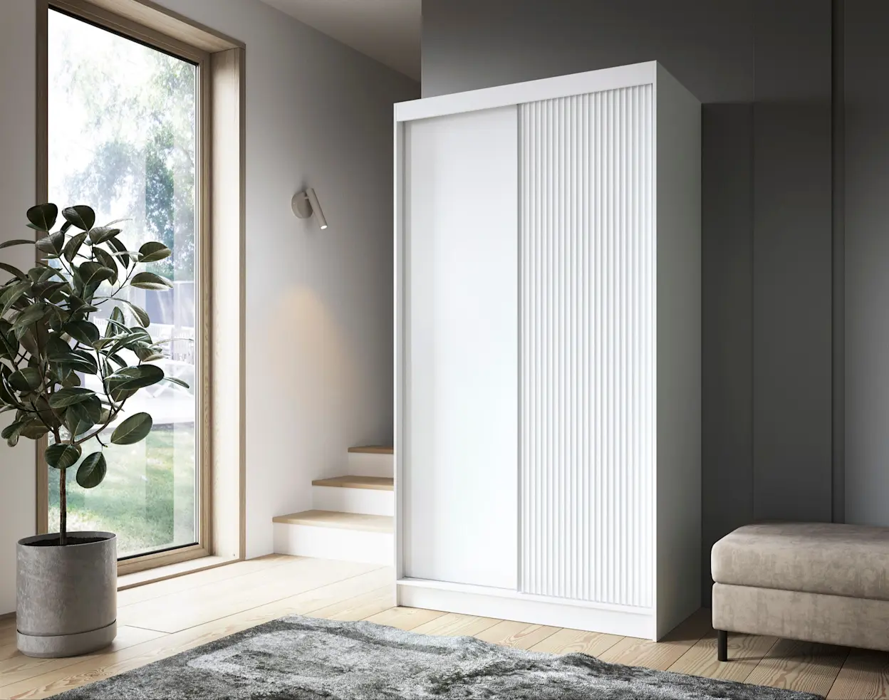 Piękna szafa przesuwna Biancco posiada drzwi ozdobione frezowanym ryflowaniem. Oznacza to stanie się niebanalnym sposobem na urozmaicenie Twojego wnętrza! Natomiast jej subtelna biel zadba o to, by kompozycja zyskała na świeżości.