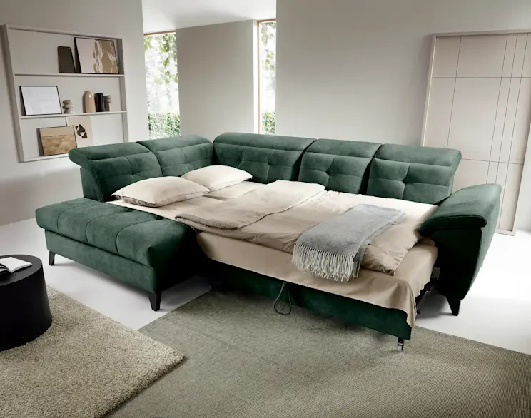 Narożnik z funkcją spania L Foble, tkanina Loco 35 zielony, cena: 4 349 zł