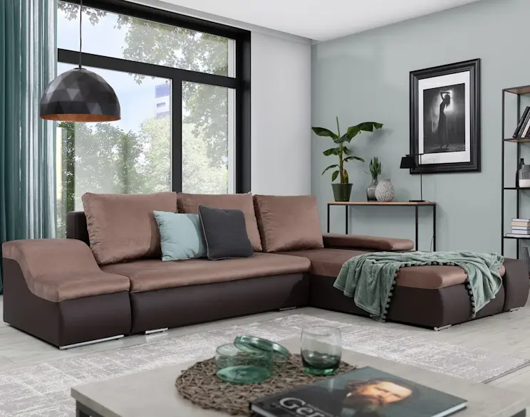 Brązowy narożnik Ontario stanowi doskonałą bazę do stworzenia aranżacji w odcieniach natury. Jego stonowane wybarwienie znakomicie współpracuje bowiem z praktycznie dowolnym odcieniem zieleni, pozwalając Ci bez ograniczeń włączać do wnętrza poduszki, koce, zasłony czy rośliny doniczkowe.